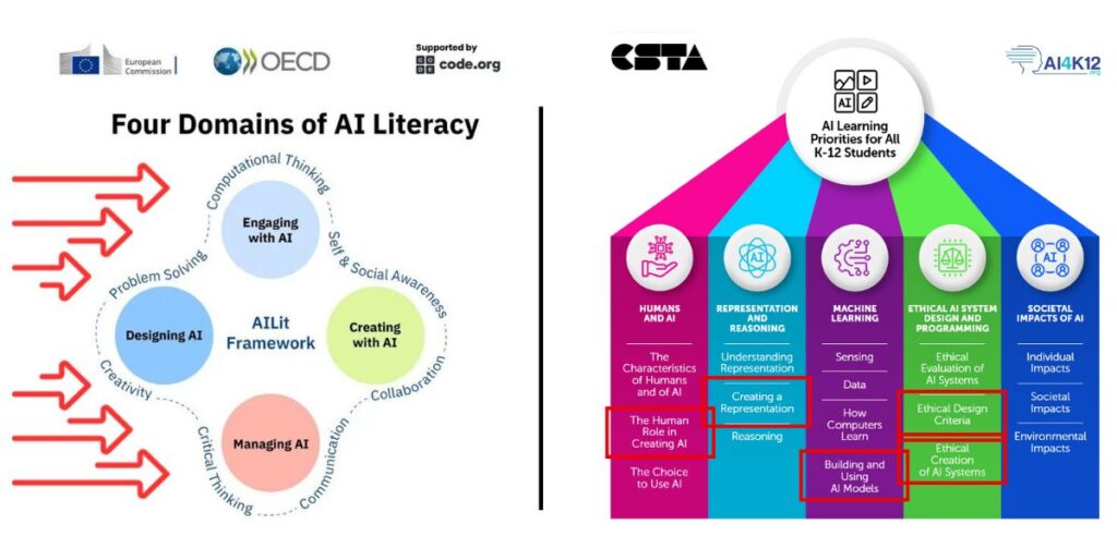Así, en las últimas semanas hemos conocido la propuesta preliminar de la Comisión Europea, desarrollada en colaboración con la OCDE y la organización Code .org. Y también hemos conocido la propuesta de la Computer Science Teacher Association, que ha contado con el apoyo de la organización AI4K12. Ambas, en línea con otras propuestas previas como la de UNESCO, coinciden en un aspecto fundamental: para poder entender cómo funcionan estos sistemas y poder usarlos de manera ética y crítica, es imprescindible aprender a diseñar y crear tus propios sistemas, ya que su mero uso no te protege frente a sus múltiples limitaciones y riesgos.