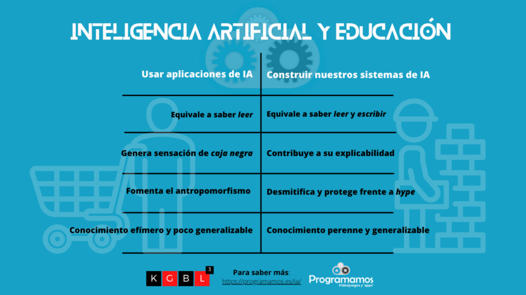 Esto es algo que desde Programamos venimos defendiendo desde hace años. En todas nuestras formaciones sobre inteligencia artificial utilizamos la siguiente infografía, que presenta la idea de que usar sistemas de inteligencia artificial equivale a saber leer, pero si además aprendes a crear tus propias soluciones basadas en esta tecnología, es como si pudieras escribir. Y no es que nos hayamos inventado nada nuevo. Simplemente hemos estudiado lo que las personas pioneras en este campo vienen defendiendo desde hace seis décadas. En especial, con el desarrollo de la pedagogía construccionista nacida tras la creación de Logo en el laboratorio de inteligencia artificial del Media Lab en el MIT.